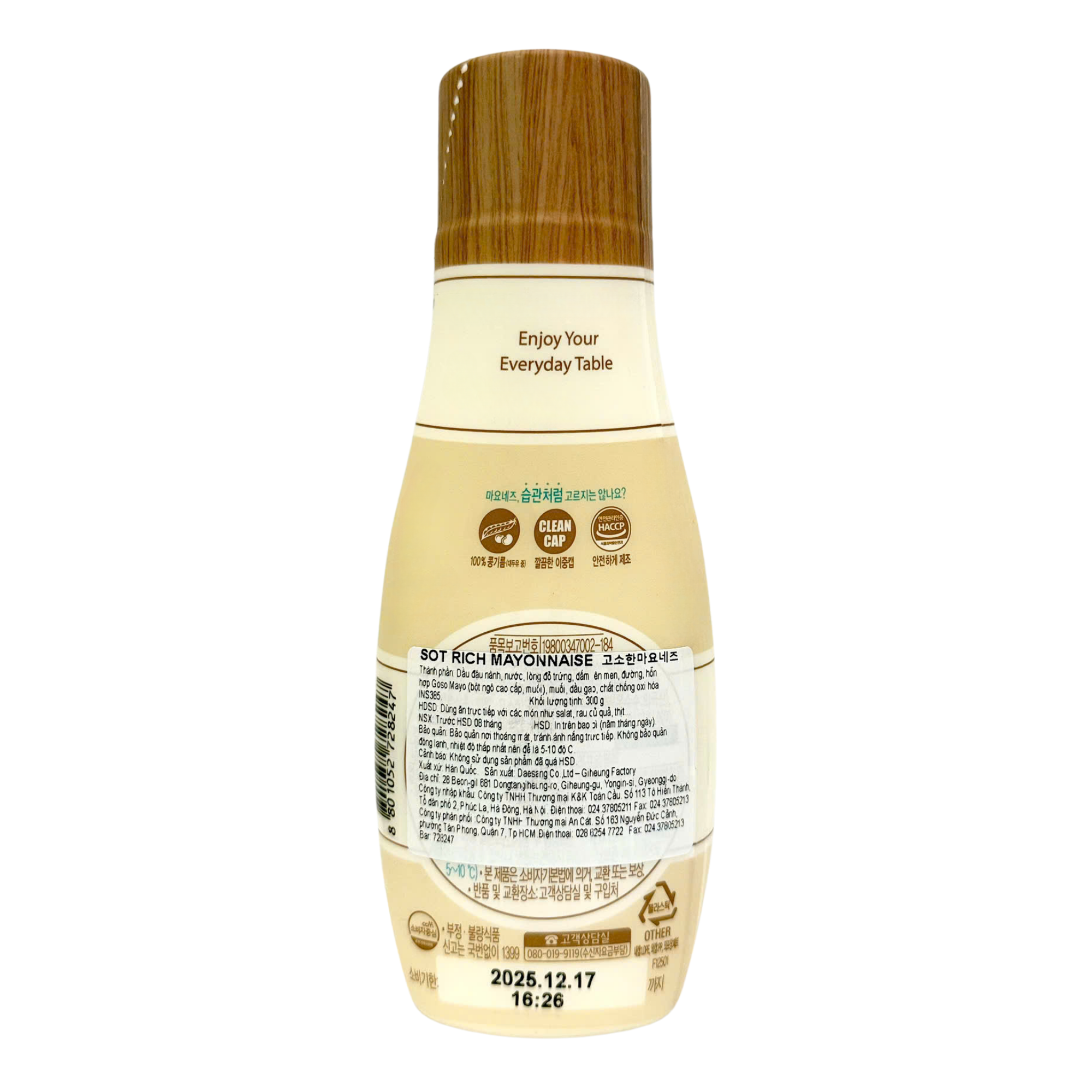 Thành phần: Dầu đậu nành, trứng gà tươi, giấm, muối tinh luyện, đường tinh luyện, protein đậu nành, chất ổn định, dầu gia vị,...