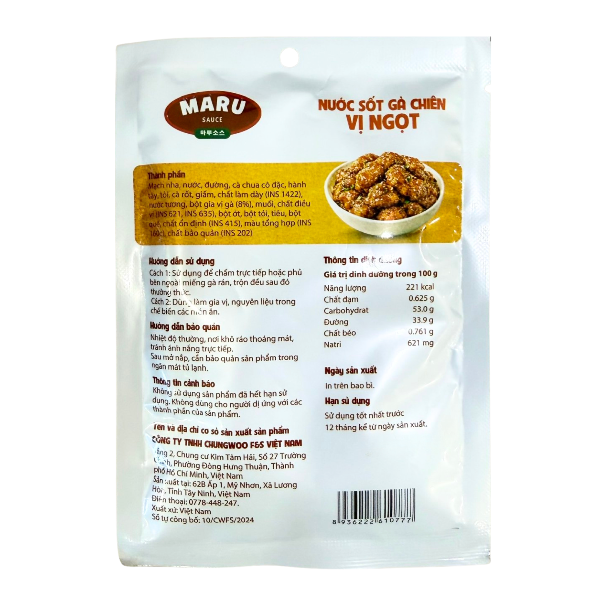 Thành phần: Mạch nha, nước, đường, cà chua cô đặc, hành tây, tỏi, cà rốt, giấm, chất làm dày (INS 1422), nước tương, bột gia vị gà (8%), muối, chất điều vị (INS 621, INS 635), bột ớt, bột tỏi, tiêu, bột quế, chất ổn định (INS 415), màu tổng hợp (INS 160c), chất bảo quản (INS 202).