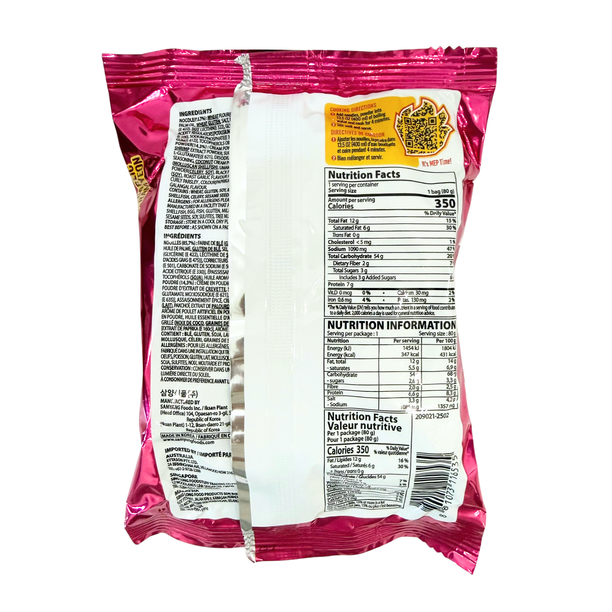 • Gói súp (14,3%): bột kem (sữa, đậu nành), muối, bột tỏi, bột chiết xuất tôm, đường, chất điều vị (mononatri l-glutamat (e 621), dinatri 5’-ribonucleotide (e 635)), gia vị cay, bột kem dừa (sữa), cải thìa, chiết xuất nghêu (nhuyễn thể có vỏ), bột umami, bột hương gà nhân tạo (cần tây, đậu nành), bột tiêu đen, tinh dầu tỏi, rau mùi tây, màu tự nhiên (chiết xuất ớt paprika (e 160c)), hương gà nhân tạo, dừa, mè.