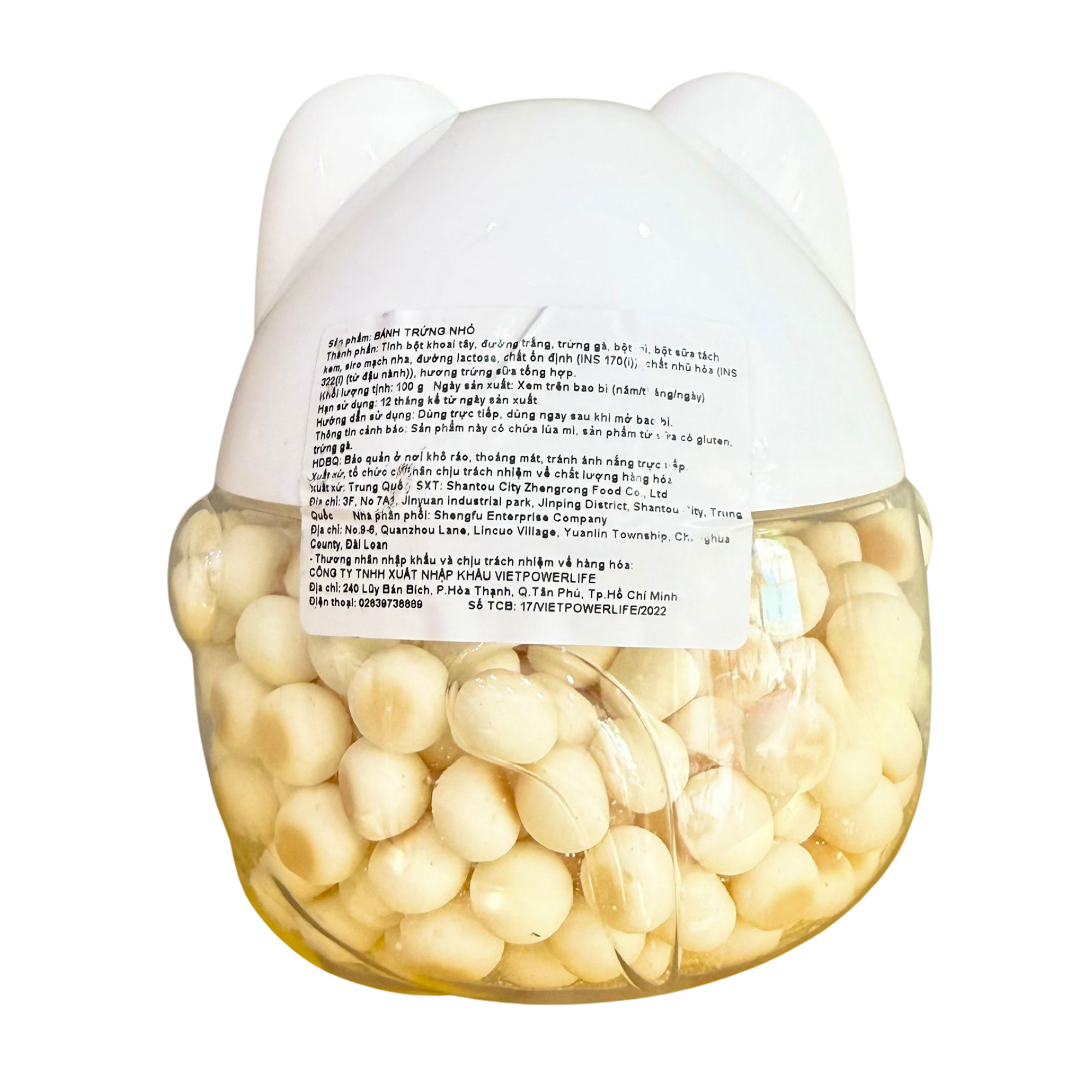 Thành phần: Tinh bột khoai tây, đường trắng, trứng gà, bột mì, bột sữa tách kem, siro mạch nha, đường lactose, chất ổn định (INS 170i), chất nhũ hóa INS 322(i)), hương trứng sữa tổng hợp.