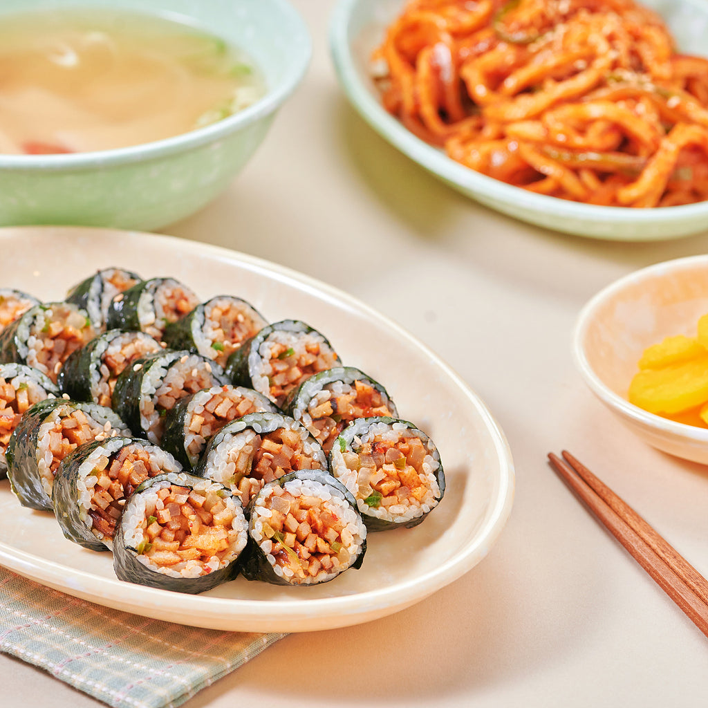 Kimbap (Rong biển cuộn cơm) - món ăn là sự kết hợp hài hòa giữa cơm và các nguyên liệu rau củ (xúc xích, thanh cua...), được nén chặt và bao bọc bởi lá rong biển. Dễ dàng làm tại nhà cùng các bước thực hiện đơn giản. Kimbap luôn là món được lựa chọn mang theo khi cắm trại, hội hè, họp nhóm, team building...