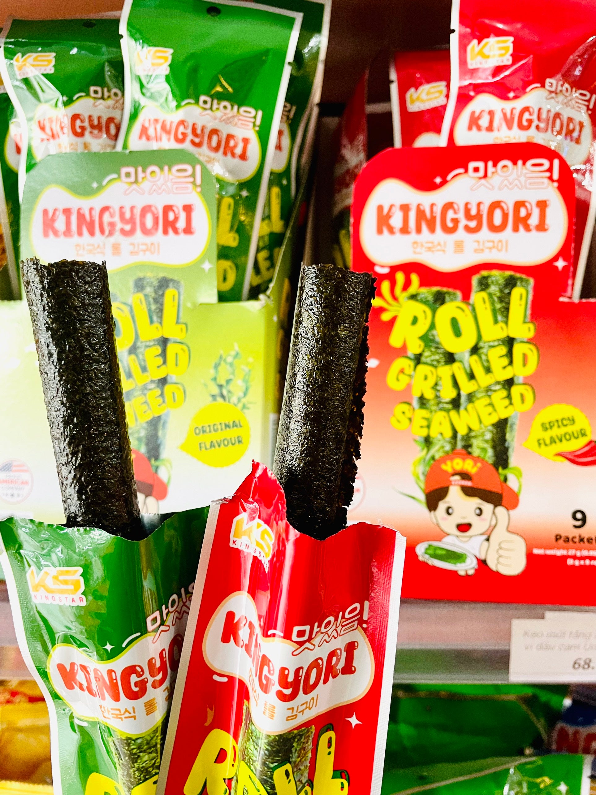 Snack rong biển cuộn nướng Kingyori vị cay – một loại seaweed tiện lợi và hấp dẫn, dễ dàng bỏ túi khi di chuyển và cầm ăn trực tiếp trong bao bì mà không sợ dính tay.
