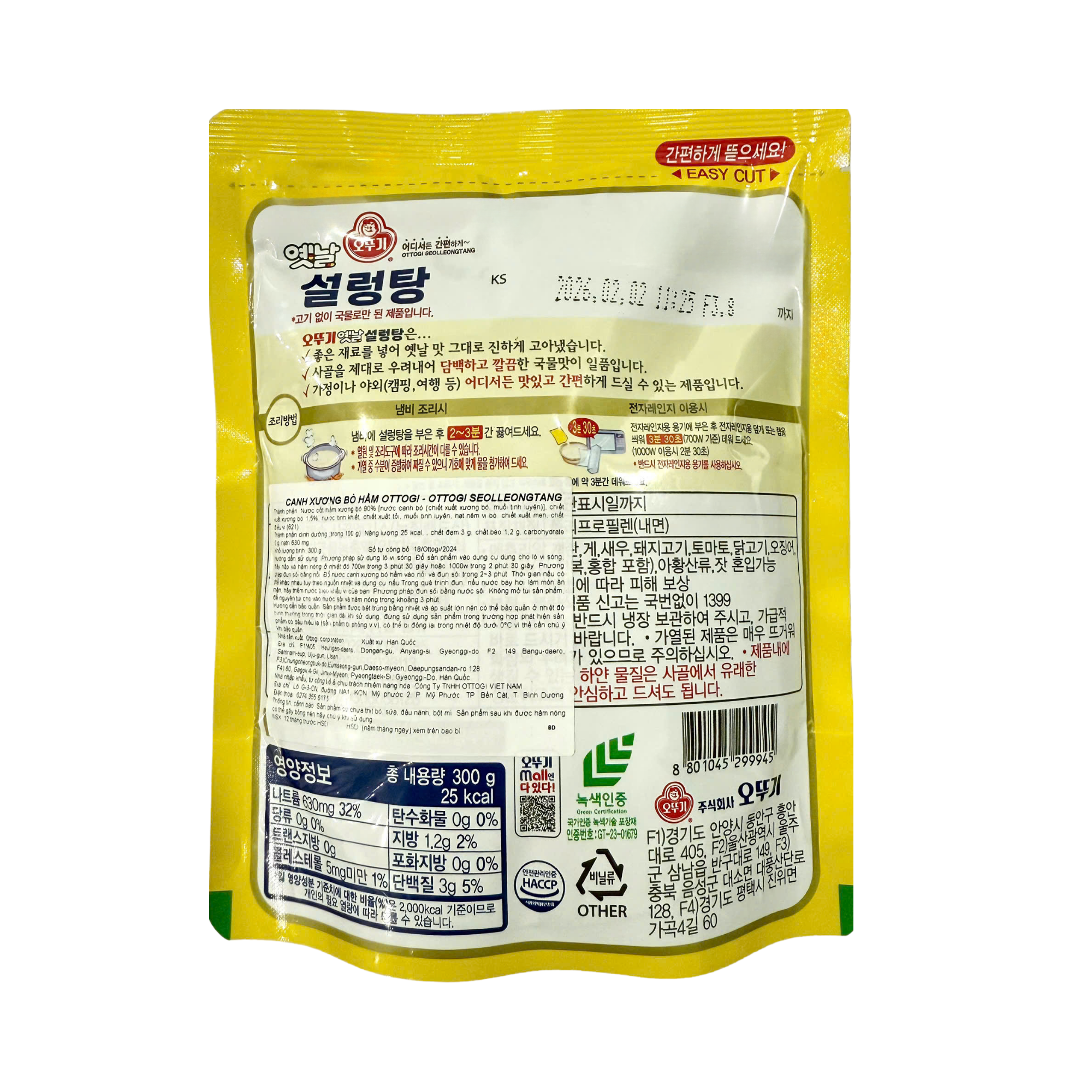 Thành phần: Nước cốt hầm xương bò 90% [nước canh bò (chiết xuất xương bò, muối tinh luyện)], chiết xuất xương bò 1.5%, nước tinh khiết, chiết xuất tỏi, muối tinh luyện, hạt nêm vị bò, chiết xuất men, chất điều vị (621).