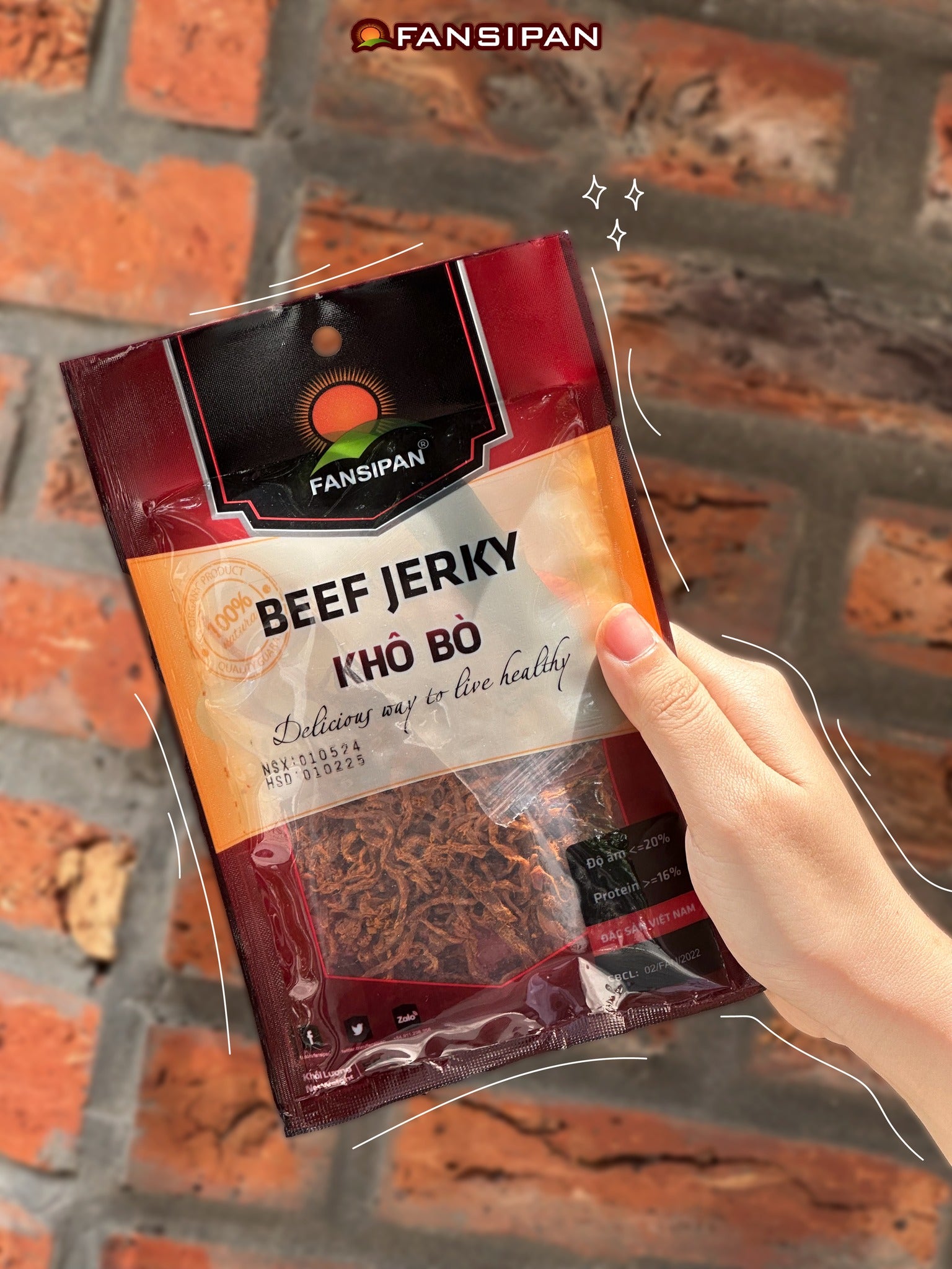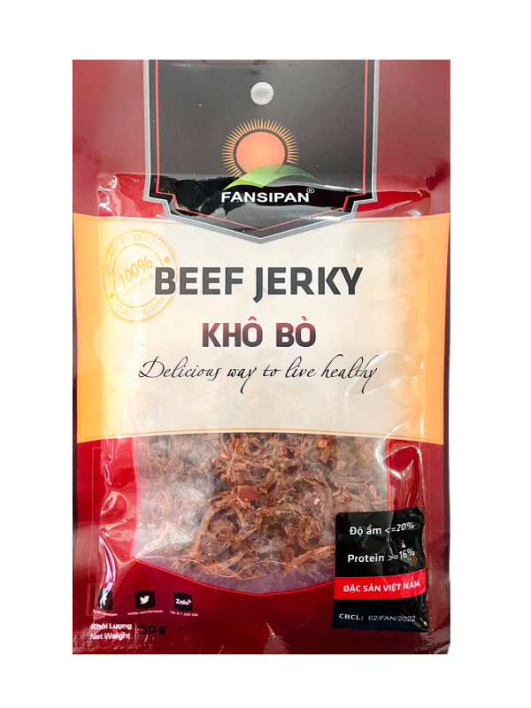 - Khô bò Fansipan 50g được chế biến từ thịt bò tươi ngon kết hợp với gia vị truyền thống. Khô bò được sấy khô hoàn hảo, giữ nguyên độ mềm dai của thớ thịt, cùng hương thơm đặc trưng khó cưỡng.