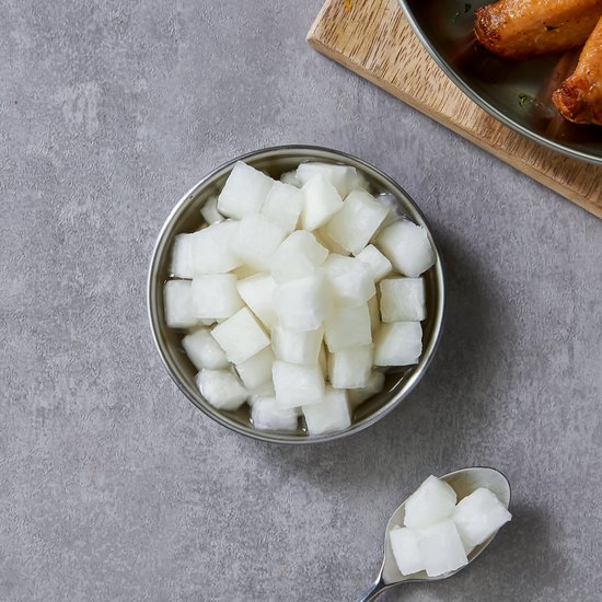 Củ cải muối trắng Haeju Farm được muối từ củ cải Việt Nam tươi giòn, hương vị chua dịu, giòn mát, lý tưởng để ăn kèm món gà rán, gà chiên, món nướng hoặc cơm cuộn Hàn Quốc.