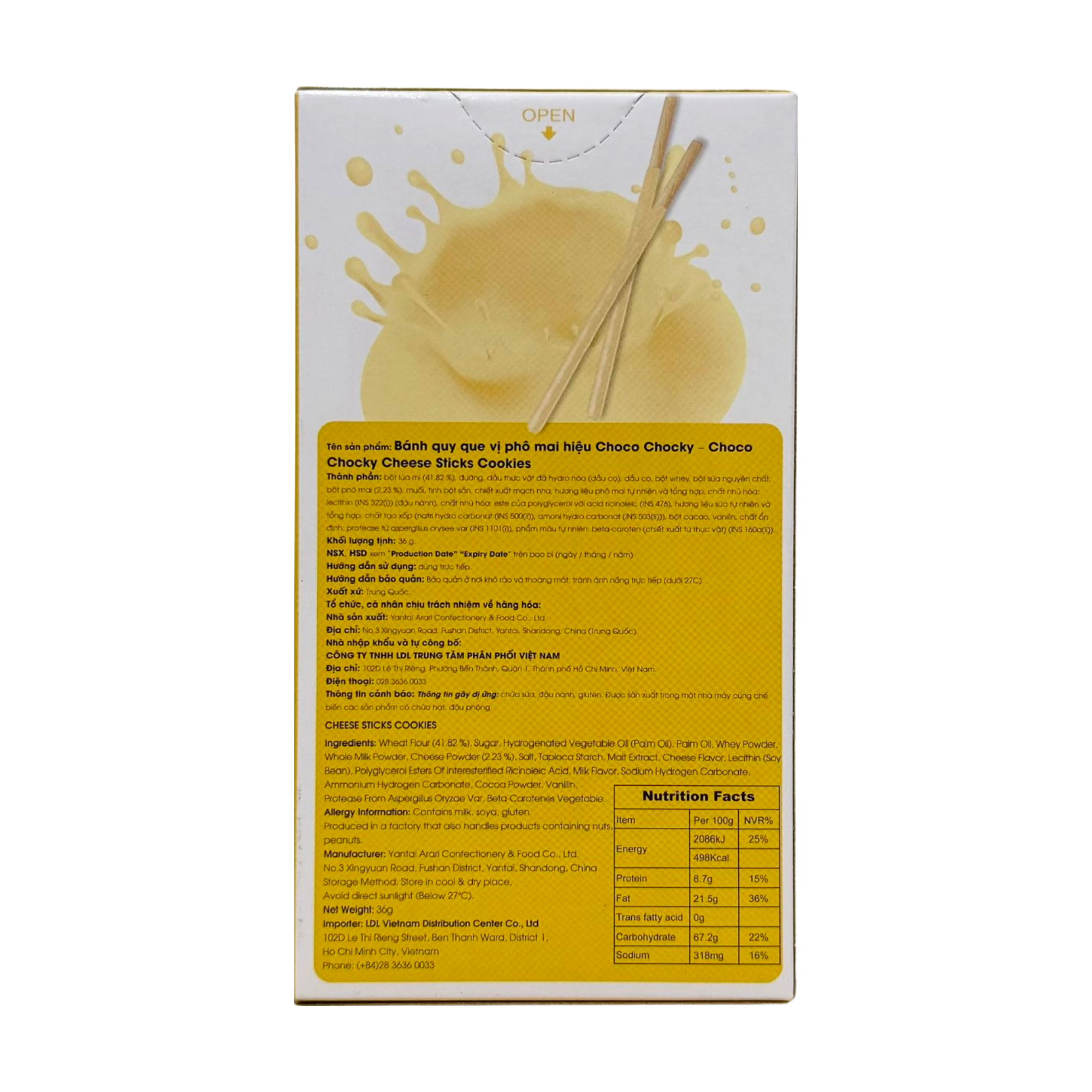 Thành phần: bột lúa mì, đường, dầu thực vật, bột whey, bột sữa nguyên chất, bột phô mai, muối, dầu cọ, tinh bột sắn, muối, hương liệu phô mai tự nhiên và tổng hợp, bột cacao, vanilin, chiết xuất mạch nha, vanilin, chất nhũ hóa, chất tạo xốp, chất ổn định...