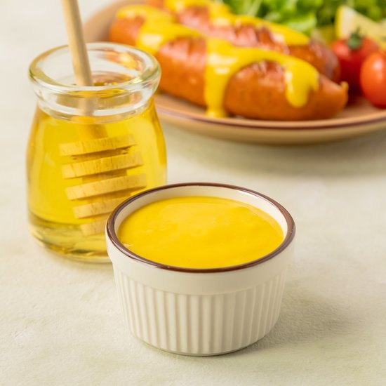 Thành phần: Nước, dầu đậu nành, mù tạt cô đặc (16,7%), đường, mật ong (10%), giấm, lòng đỏ trứng gà, chất làm dày (acetylated distarch adipat (1422), gôm xanthan (415)), muối i-ốt, bột mù tạt (0,4%), dầu gia vị (dầu đậu nành, dầu nghệ, dầu ớt, hương bơ tự nhiên), mật đường khô, gia vị (quế, đinh hương), chất chống oxi hóa (calci dinatri etylendiamintetraacetat (385)), phẩm màu (riboflavin tổng hợp 101(i)).