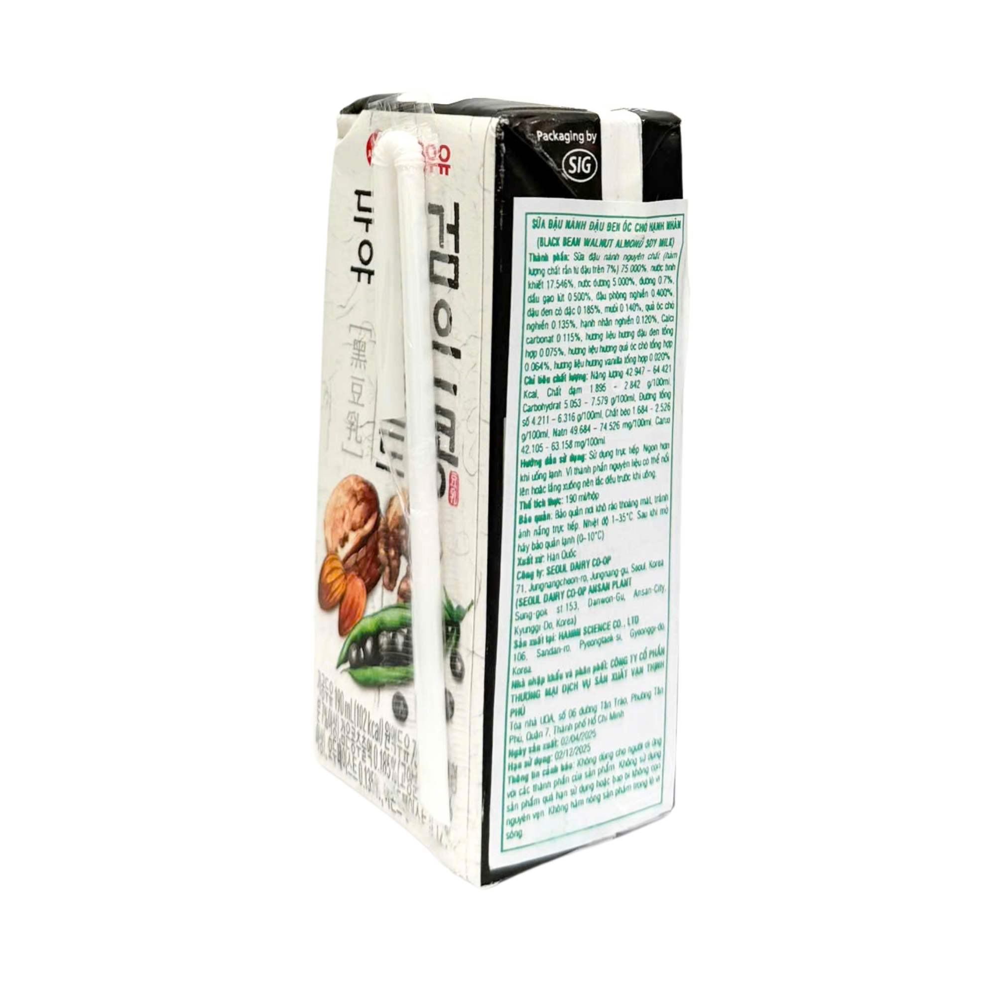 Thành phần: Sữa đậu nành nguyên chất (hàm lượng chất rắn từ đậu trên 7%) 75%, nước tinh khiết 17.546, nước đường 5%, đường 0.7%, dầu gạo lứt 0.5%, đậu phộng nghiền 0.4%, đậu đen cô đặc 0.185%, muối 0.14%, hạt óc chó nghiền 0.135%, hạnh nhân nghiền 0.12%, calci carbonat 0.115%, hương liệu hương đậu đen tổng hợp 0.075%, hương liệu hương quả óc chó tổng hợp 0.064%, hương liệu hương vani tổng hợp 0.02%.