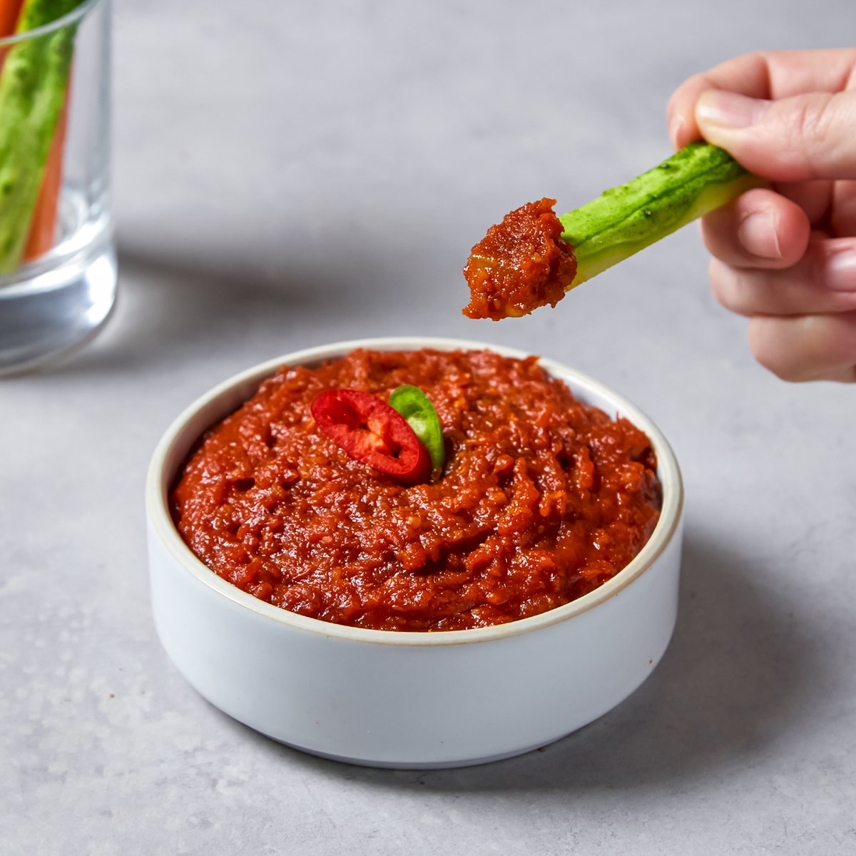 Thành phần: Tương đậu nành 52% [đậu nành (nhập khẩu), bột mì (Lúa mì: nhập khẩu Mỹ Úc), muối tinh, lúa mì, bột đậu nành lên men], mạch nha, bột mì (lúa mì: nhập khẩu Mỹ, Úc), nước tinh khiết, gia vị ớt (nhập khẩu Trung Quốc), hành tây, cồn thực phẩm, bột gia vị ớt, đường trắng, bột đậu nành tách béo, muối tinh, nước tương, chiết xuất rau, nấm men, Enzymatically Modified Stevia