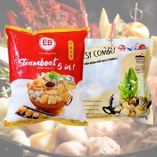Combo 2 bịch viên thả lẩu 5 trong 1 Asean – Lựa chọn quá đã và siêu tiết kiệm cho một nồi hotpot full topping ngập tràn, đặc biệt còn là nhiều loại viên thả lẩu khác nhau đến từ 2 thương hiệu nổi tiếng là EB (Malaysia) và PFP (Thái Lan)