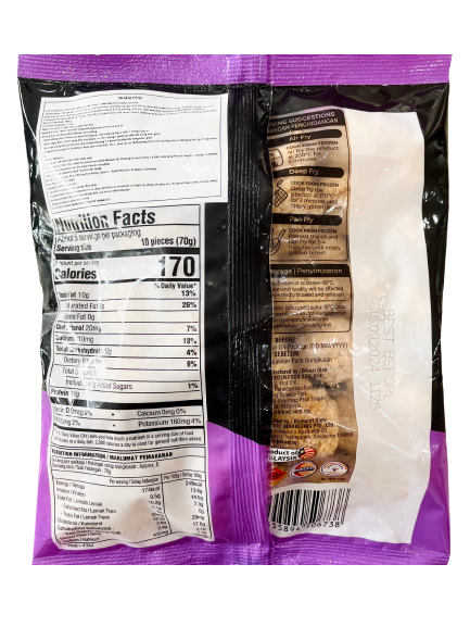 Thành phần: Thịt gà (65.53%), bột mì, mỡ trừu thực vật (dầu cọ), gia vị 2.81%, đạm đậu nành, bột năng, chất điều vị [Mononatri Lglutamat (621)], chất làm dày [tinh bột sắn biến tính (1414)], đường, bột nở, chất làm ẩm, chất điều vị (chiết xuất nấm men), muối, chất tạo màu nhân tạo