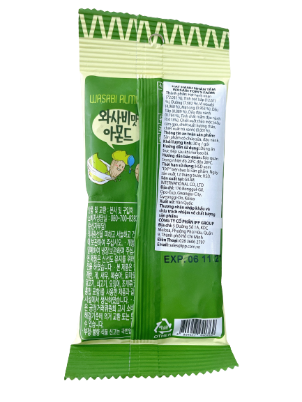 Thành phần: Hạt hạnh nhân (72.031%), đường (7.682%), tinh bột bắp (12.677%), vị wasabi (4.960%), dầu bắp (0.882%), dầu đậu nành (0.794%), mật ong (0.953%) tinh chất mầm đậu nành (0.013%), chiết xuất thảo mộc (dầu cám gạo, chiết xuất hương thảo, chiết xuất trà xanh) (0.001%)