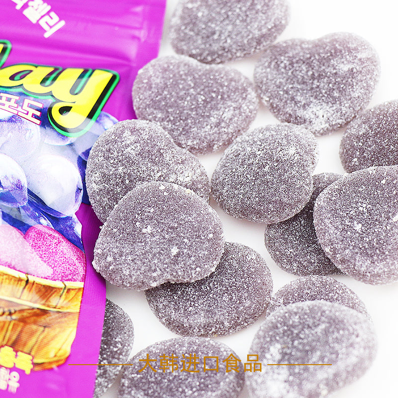 Kẹo có hình dạng trái tim xinh xắn với màu tím đặc trưng của nho. Bên ngoài được phủ một lớp đường trắng tạo nên vị ngọt ngay khi vừa cắn vào. Độ dẻo của jelly kết hợp với hương nho thơm lan tỏa hứa hẹn sẽ mang đến bạn một món snack thú vị!