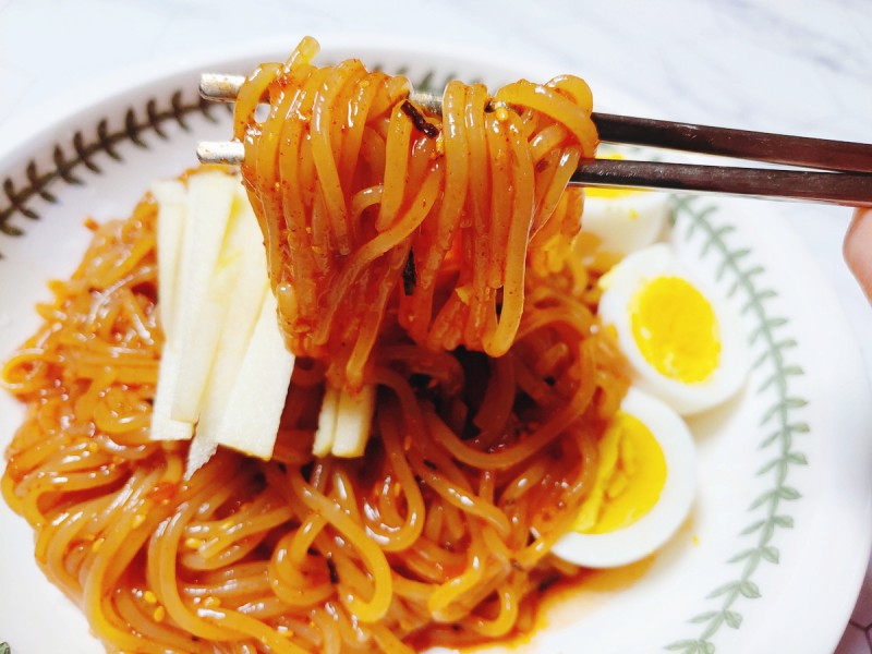 Sốt bibimjang sền sệt với màu đỏ bắt mắt, có hương vị ngọt, chua cay được làm từ sự kết hợp của nhiều gia vị như nước đường bắp, giấm, tỏi, ớt, xì dầu, mè, gừng,...Chỉ cần trộn sốt vào mì sau khi luộc chín là sẽ có ngay một dĩa spicy jjolmyeon hấp dẫn, siêu kích vị giác. Càng ngon hơn khi ăn cùng với trứng, thịt, dưa leo, trứng luộc,...