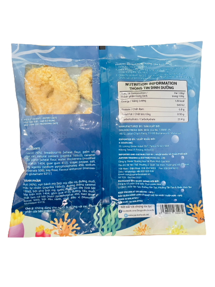 Thành phần: Mực 40%, vụn bánh mì [bột mì, dầu cọ, đường, muối, màu tự nhiên (paprika 160c(i), đường thắng caramel 150a)], bột pha [bột mỳ, nước, chất làm dày (tinh bột bắp biến tính 1404, gôm gua 412), đường, tiêu, muối, chất làm nở bột, bột đậu nành, chất điều vị,...