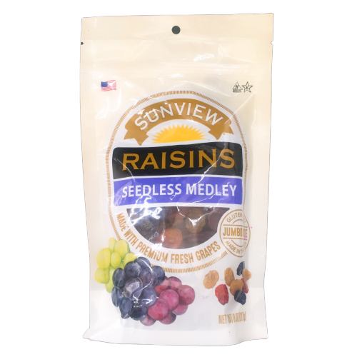 Thành phần: Nho khô california xanh, đỏ, đen và vàng không hạt, dầu được xử lý dưới 1%, sulfur dioxide được thêm vào như một chất bảo quản.